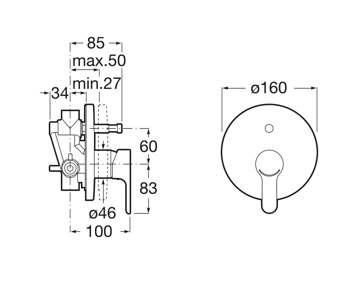 Εξωτερικό και εσωτερικό τμήμα αναμίκτη εντοιχιζόμενου, δυο εξόδων, της σειράς L20 από την Roca.