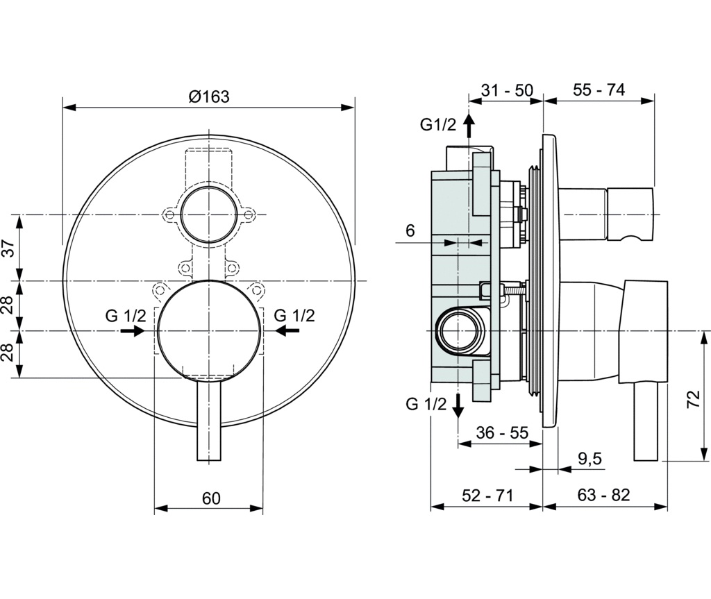 Εξωτερικό και εσωτερικό τμήμα εντοιχιζόμενης, αναμικτικής μπαταρίας της σειράς Ceraline από την Ideal Standard.
