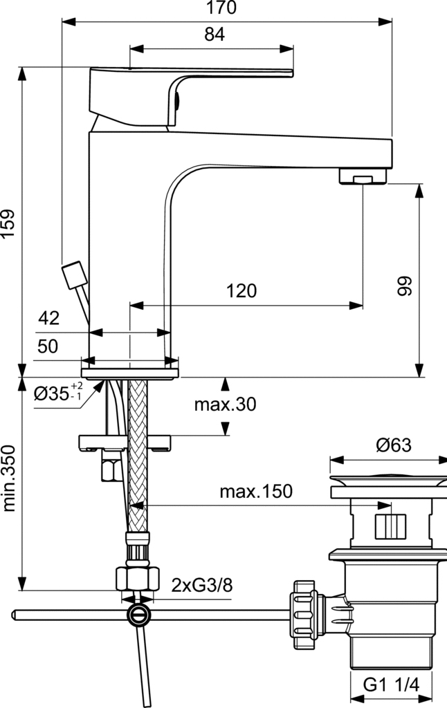 Αναμικτική μπαταρία νιπτήρα, 1 οπής, μέγιστη ροή νερού 5lt/λεπτό, μηχανισμό ελέγχου-καθορισμού της μέγιστης θερμοκρασίας, εύκαμπτους σωλήνες G3/8“, σύστημα τοποθέτησης Easy-Fix, και αυτόματη πλαστική βαλβίδα, χρωμέ.