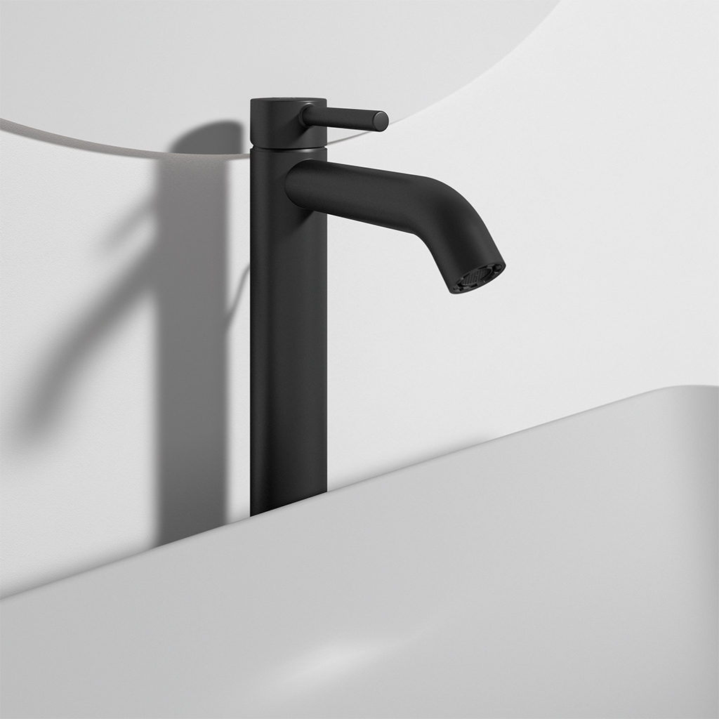 Αναμικτική μπαταρία νιπτήρα, 1 οπής, με ψηλό κορμό, με 28mm μηχανισμό, μέγιστη ροή νερού 5lt/λεπτό, εύκαμπτους σωλήνες G3/8‘‘, σύστημα τοποθέτησης Easy-fix και μεταλλική αυτόματη βαλβίδα, silk black.