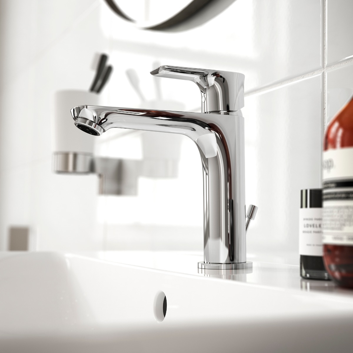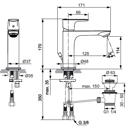Επικαθήμενη αναμεικτική μπαταρία νιπτήρα GRANDE, 1 οπής, φίλτρο με προσαρμοζόμενη κατεύθυνση ροής με μέγιστη ροή νερού 5lt/λεπτό, με μηχανισμό 25mm, εύκαμπτους σωλήνες G3/8‘‘, σύστημα τοποθέτησης Easy-fix και μεταλλική αυτόματη βαλβίδα, χρωμέ.