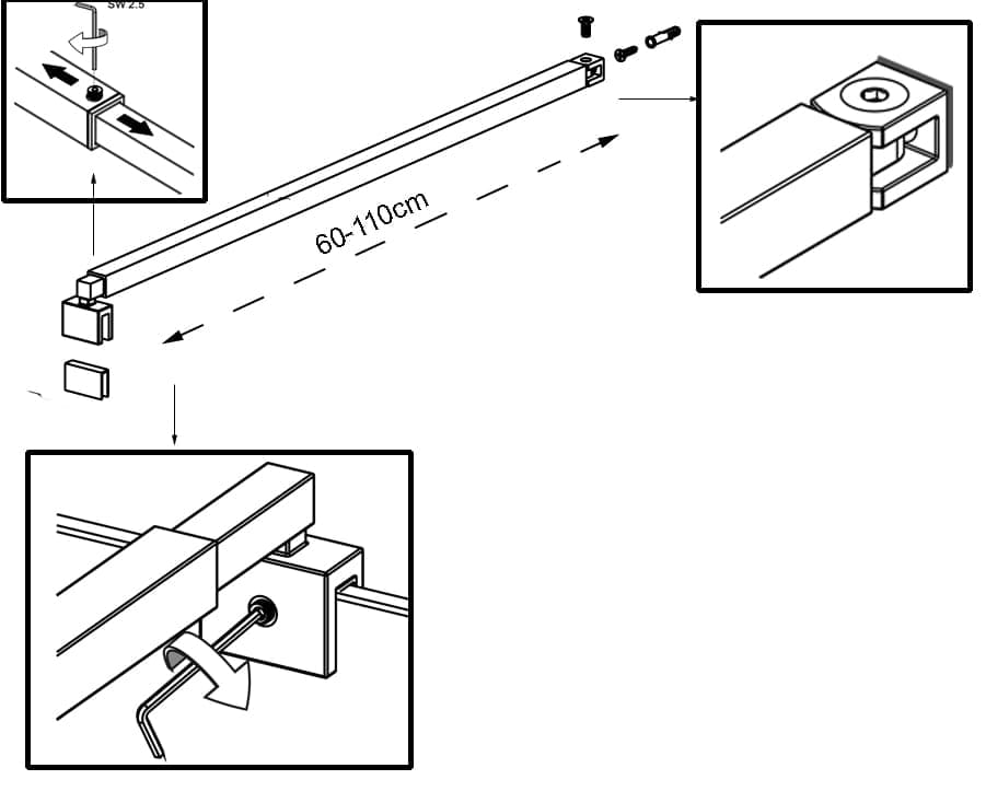 Πτυσσόμενη ρυθμιζόμενη αντηρίδα κρυστάλλου καμπίνας τοίχου 60 έως 110cm κάθετης η γωνιακής στήριξης.