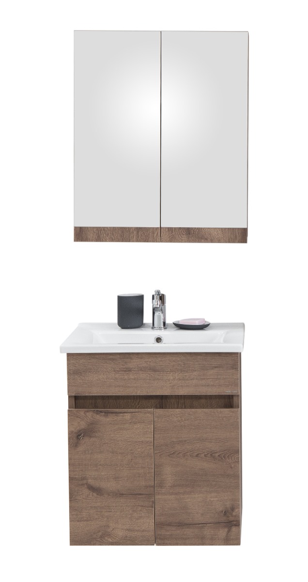 Καθρέπτης μπάνιου 65cm, της συλλογής Mona, με δυο ντουλάπια, σε καφέ απόχρωση και εφέ φυσικής καρυδιάς.