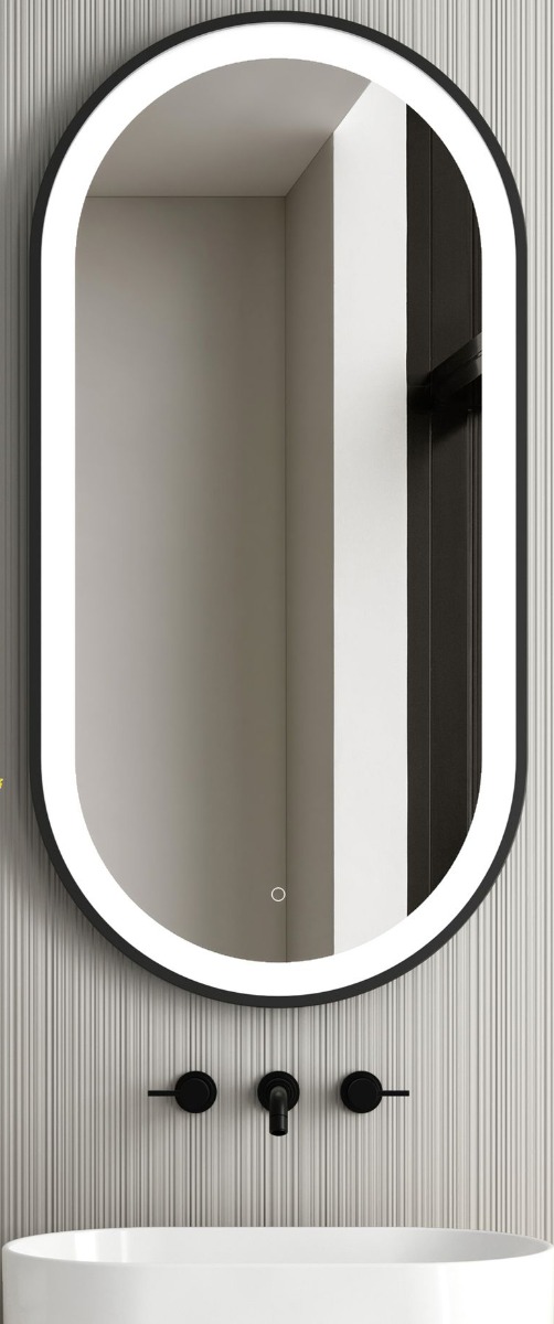 Οβάλ καθρέπτης μπάνιου με εμφανές πλαίσιο μαύρο ματ αλουμινίου και με διάσταση 45x90cm. Με περιμετρικό φωτισμό ημέρας και διακόπτη αφής.