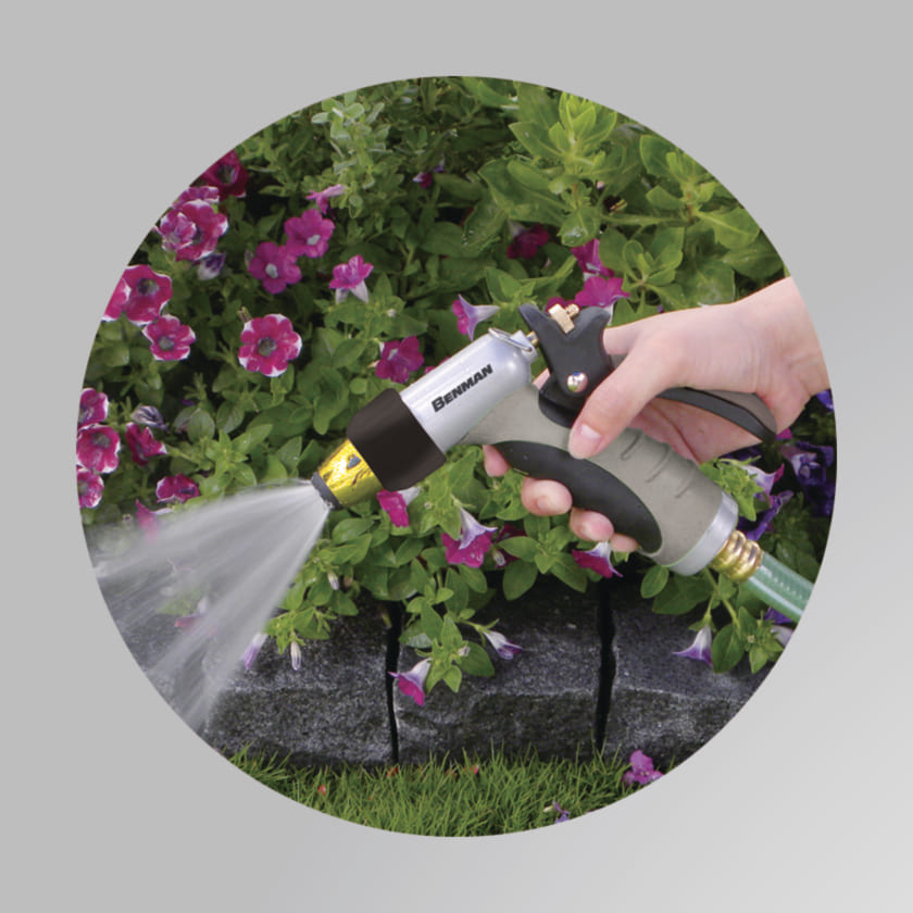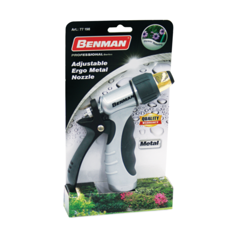 Ρυθμιζόμενο μεταλλικό πιστόλι ποτίσματος. Κατασκευάζεται από ενισχυμένη μεταλλική πρώτη ύλη, διαθέτει ινοπλισμένη σκανδάλη εργονομικά σχεδιασμένη, έχει εξαιρετικά μαλακή επίστρωση και υποδοχή ταχυσυνδέσμων τύπου Universal. Η υποδοχή ταχυσύνδεσμου Universal είναι συμβατή με τους περισσότερους ταχυσυνδέσμους.